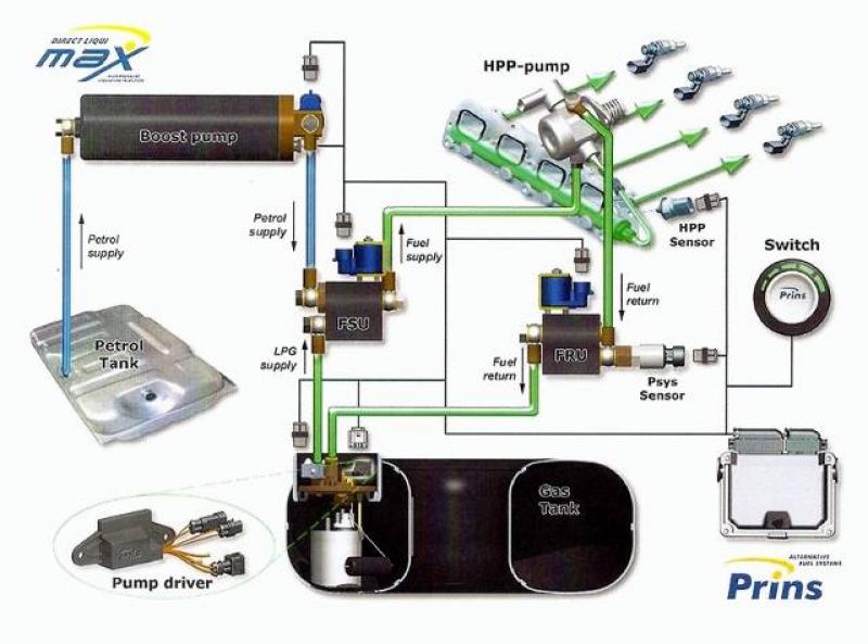Sistemul Prins Direct LiquiMax utilizează o pompa de înalta presiune, injectând GPL-ul lichid la o presiune mare prin injectoarele originale de benzina.